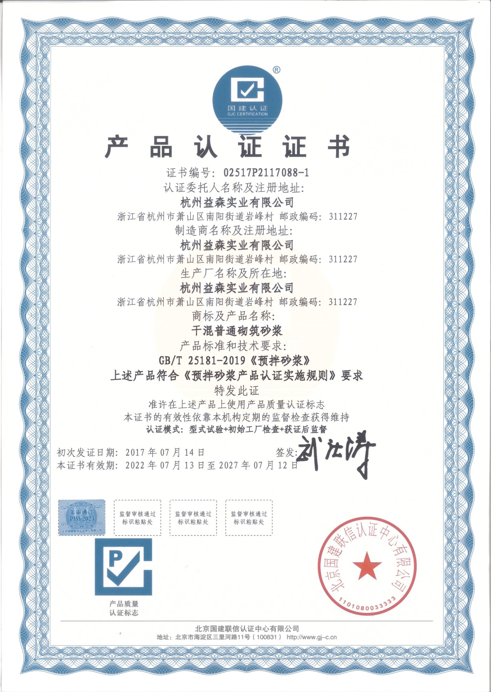 产品认证证书(干混陶瓷砖粘结砂浆)