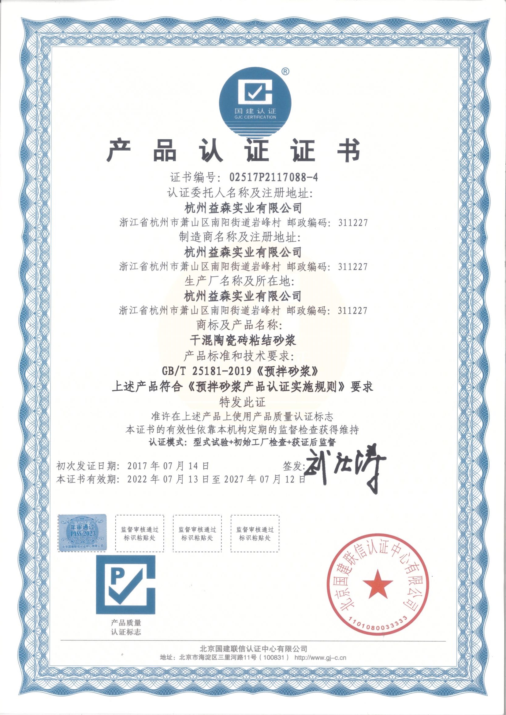 产品认证证书(干混陶瓷砖粘结砂浆)