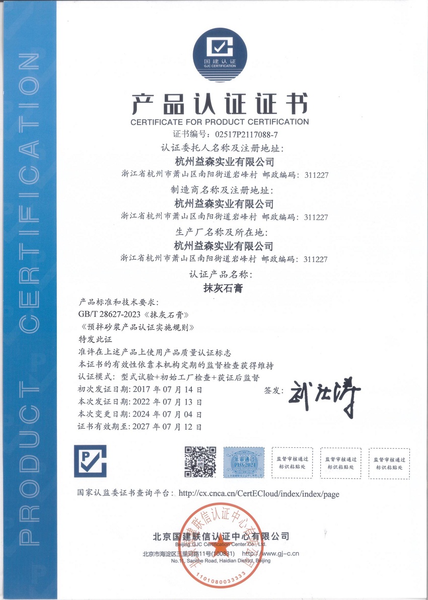 产品认证证书(干混陶瓷砖粘结砂浆)