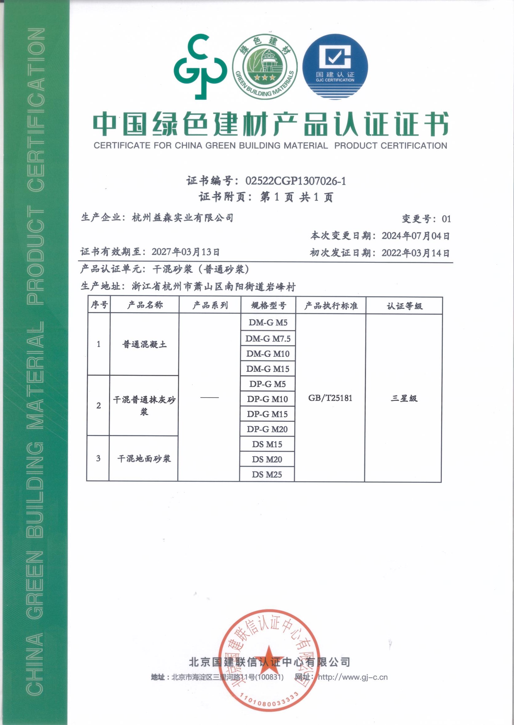 绿色建材认证证书(普通砂浆001)
